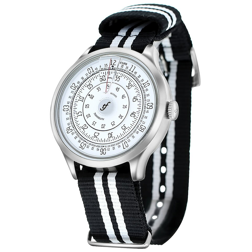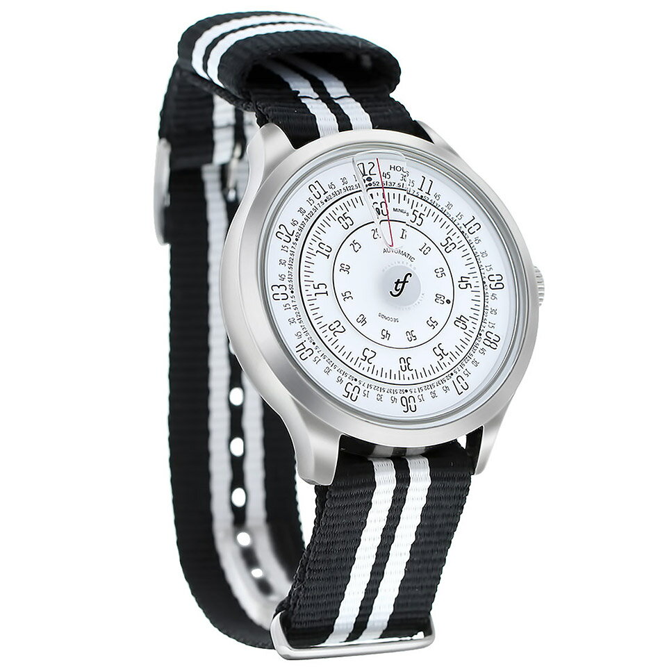 Ref. ML211SSWH ケース 素材 316Lステンレススティール / サイズ 42 mm / カラー STEEL 風防 素材 K1ガラス(サファイアコート) / ドーム型レンズ 文字盤 エナメル / 回転ディスク文字盤 / カラー WHITE ムーブメント MIYOTA8215 / 自動巻き / 日本製 バンド NATOストラップ 素材 ナイロン / カラー BLACK/WHITE バンド留金 バックル 防水性能 5気圧防水 重量 90g 生産国 イタリア メーカー保証 1年間レトロなデザインのイタリア時計 トリフォグリオ 針のない回転ディスク式の腕時計 MILLIMETRO 針のない回転ディスク式のイタリア時計 トリフォグリオ 『ミリメトロ』 イタリア時計「トリフォグリオ」の『MILLIMETRO(ミリメトロ)』は、針を使用しない回転ディスク式の腕時計です。